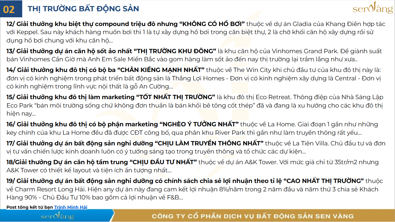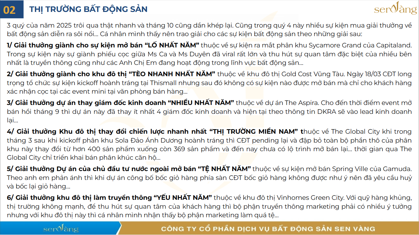 Trên đây là những thông tin tổng quan về “Điểm tin thị trường Bất động sản tuần 2 tháng 10/2025” do Sen Vàng Group cung cấp. Hy vọng với những thông tin trên giúp chủ đầu tư, nhà đầu tư và doanh nghiệp có thêm những thông tin về một trong những tiêu chí cần cân nhắc, xem xét trước khi đầu tư. Ngoài ra để xem thêm các bài viết về tư vấn phát triển dự án, anh chị, bạn đọc có thể truy cập trang web https://senvangdata.com.vn/. |