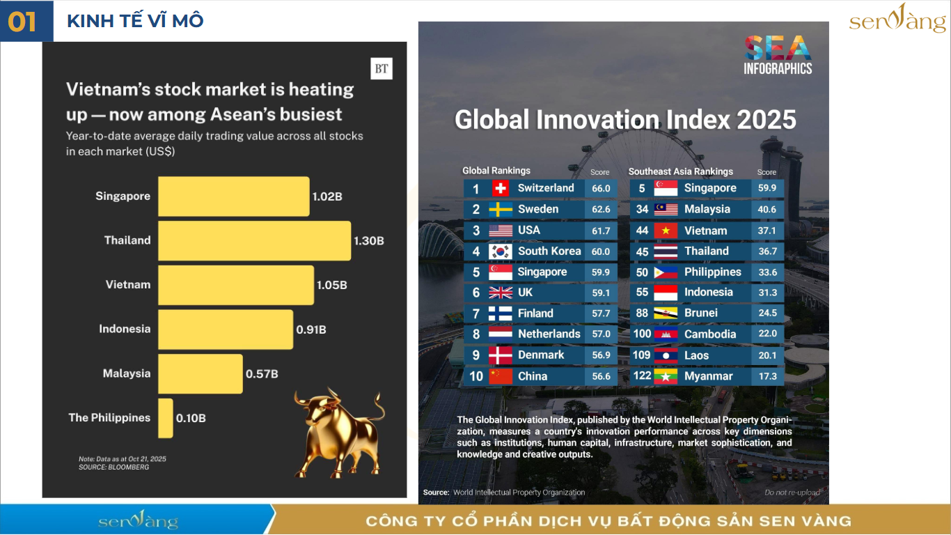 Trên bảng xếp hạng Đổi mới sáng tạo toàn cầu 2025, Việt Nam đứng thứ 43 thế giới – thứ 3 khu vực, khẳng định vị thế nền kinh tế đang chuyển mình theo hướng xanh – công nghệ – tri thức.