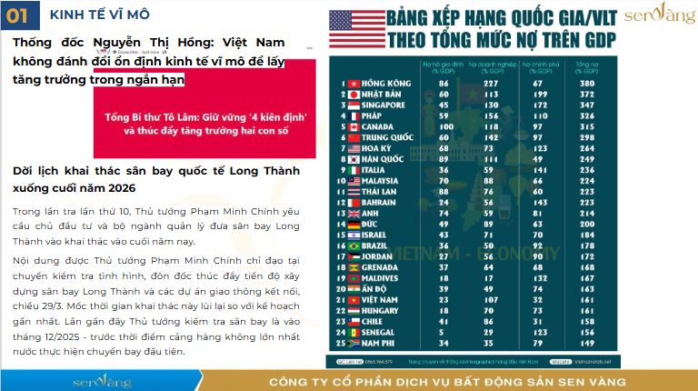 - Hạ tầng chiến lược: Sân bay Long Thành lùi tiến độ khai thác sang cuối năm 2026. Hà Nội và TP.HCM đẩy mạnh quy hoạch TOD (phát triển đô thị gắn với giao thông công cộng) với tầm nhìn dài hạn 100 năm.