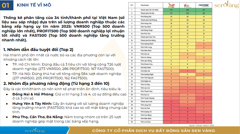- Điểm sáng địa phương: Đồng Nai đã được Trung ương đồng ý chủ trương lên Thành phố trực thuộc Trung ương. Các tỉnh như Hải Phòng, Tây Ninh cho thấy sự năng động vượt trội về tốc độ tăng trưởng doanh nghiệp.