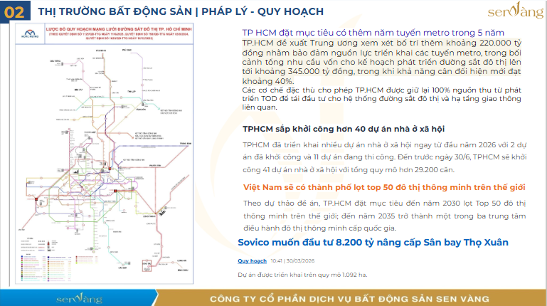 Trên đây là những thông tin tổng quan về “Điểm tin BĐS tuần 3 tháng 3/2026” do Sen Vàng Group cung cấp. Hy vọng với những thông tin trên giúp chủ đầu tư, nhà đầu tư và doanh nghiệp bất động sản có cái nhìn tổng quan về tiềm năng phát triển bất động sản. Ngoài ra để xem thêm các bài viết về tư vấn phát triển dự án, anh chị, bạn đọc có thể truy cập trang web senvangdata.com/.
