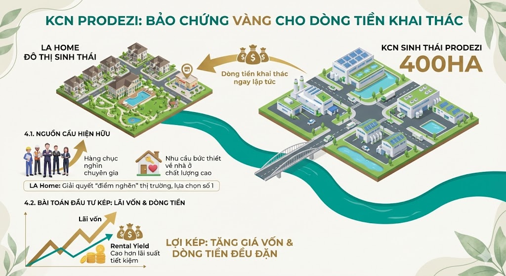 Khác với các đô thị “ngủ đông” chờ tăng giá, LA Home sở hữu lợi thế độc tôn là nằm đối diện Khu công nghiệp sinh thái Prodezi (400ha), đảm bảo dòng tiền khai thác ngay lập tức.