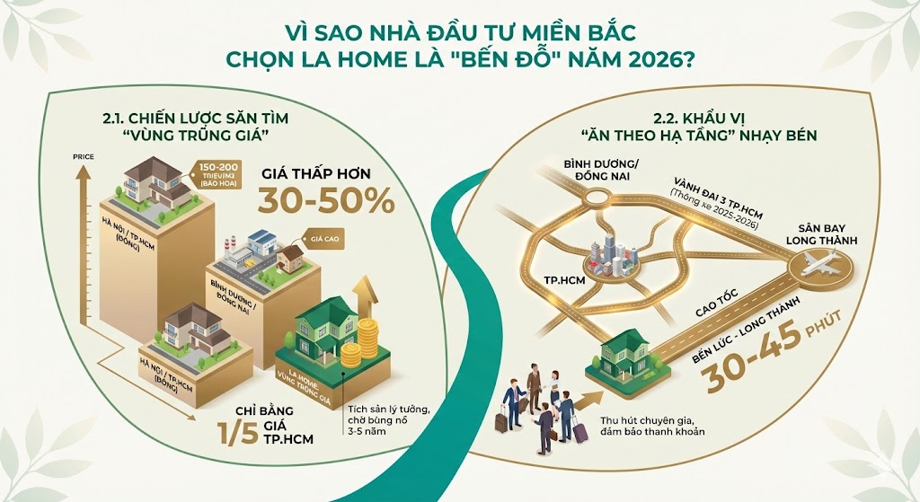 Dòng vốn từ nhà đầu tư miền Bắc (Hà Nội, Hải Phòng, Quảng Ninh) đang đổ bộ mạnh mẽ vào dự án LA Home nhờ vị thế “vùng trũng giá” hiếm hoi còn sót lại tại cửa ngõ TP.HCM. Khác với sự bão hòa tại thị trường phía Bắc hay khu Đông Sài Gòn, LA Home mang đến một bài toán đầu tư hấp dẫn với biên độ lợi nhuận rộng mở.