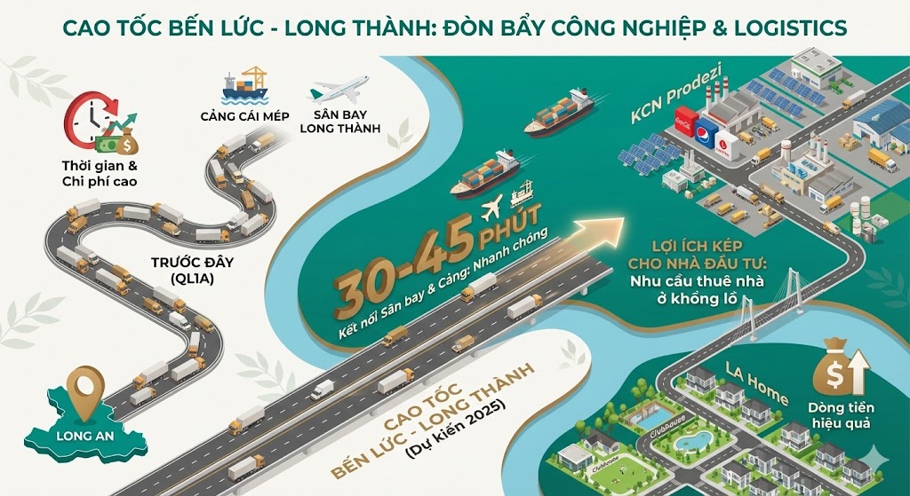 Song song đó, Cao tốc Bến Lức – Long Thành đóng vai trò là “đòn bẩy” công nghiệp và logistics, phục vụ trực tiếp cho Khu công nghiệp Prodezi nằm đối diện dự án LA Home. Tuyến cao tốc này giúp rút ngắn thời gian di chuyển từ dự án đến Sân bay Quốc tế Long Thành chỉ còn 30-45 phút, giải quyết bài toán vận chuyển hàng hóa và thu hút dòng vốn FDI.