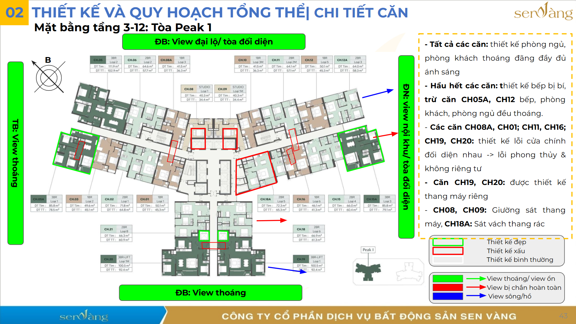 - Đánh giá tầm view: Tầm nhìn đẹp nhất và thoáng nhất rơi vào hướng Tây Nam và Tây Bắc (ở các tầng cao), bao quát toàn cảnh sông Hồng. Các hướng Đông Bắc và Đông Nam tòa Peak 1 dù bị chắn bởi dự án MIK và tòa nhà đối diện nhưng nhờ khoảng cách xa nên vẫn đảm bảo tính riêng tư và có view nội khu ở các căn thấp tầng