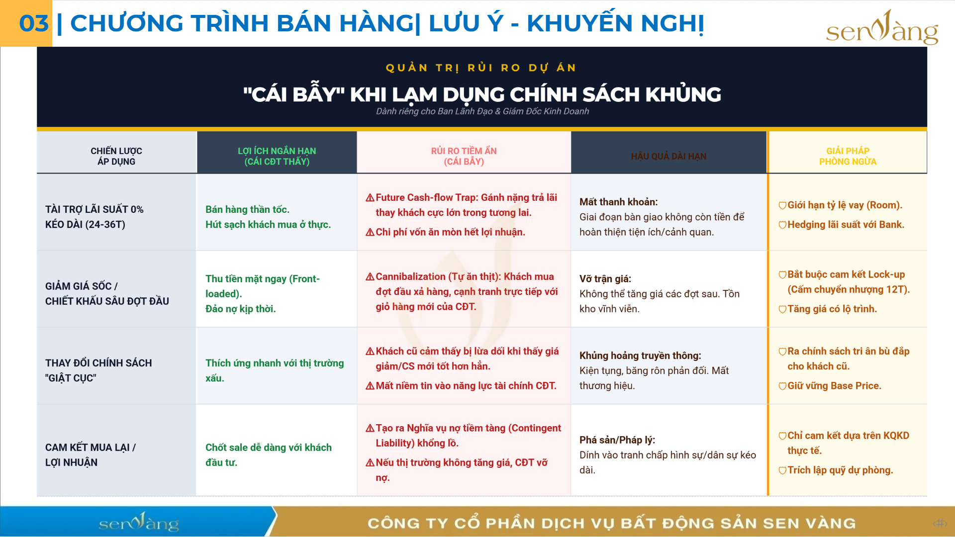 “Cạm bẫy ngọt ngào” của chính sách lãi suất: Giá bán thực tế đã cộng chi phí tài chính. Khi hết thời gian ưu đãi, lãi suất thả nổi có thể tăng vọt (lên trên 13%/năm), gây áp lực trả nợ khổng lồ và nguy cơ gãy đòn bẩy tài chính.