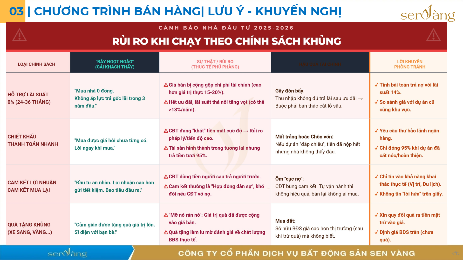 Rủi ro bong bóng từ cơ cấu khách hàng: Một dự án có 70-80% là nhà đầu tư sẽ đối mặt với làn sóng bán tháo ồ ạt khi hết thời gian hỗ trợ lãi suất. Điều này làm giảm giá trị dự án, mất uy tín và tạo ra các “khu đô thị ma”.