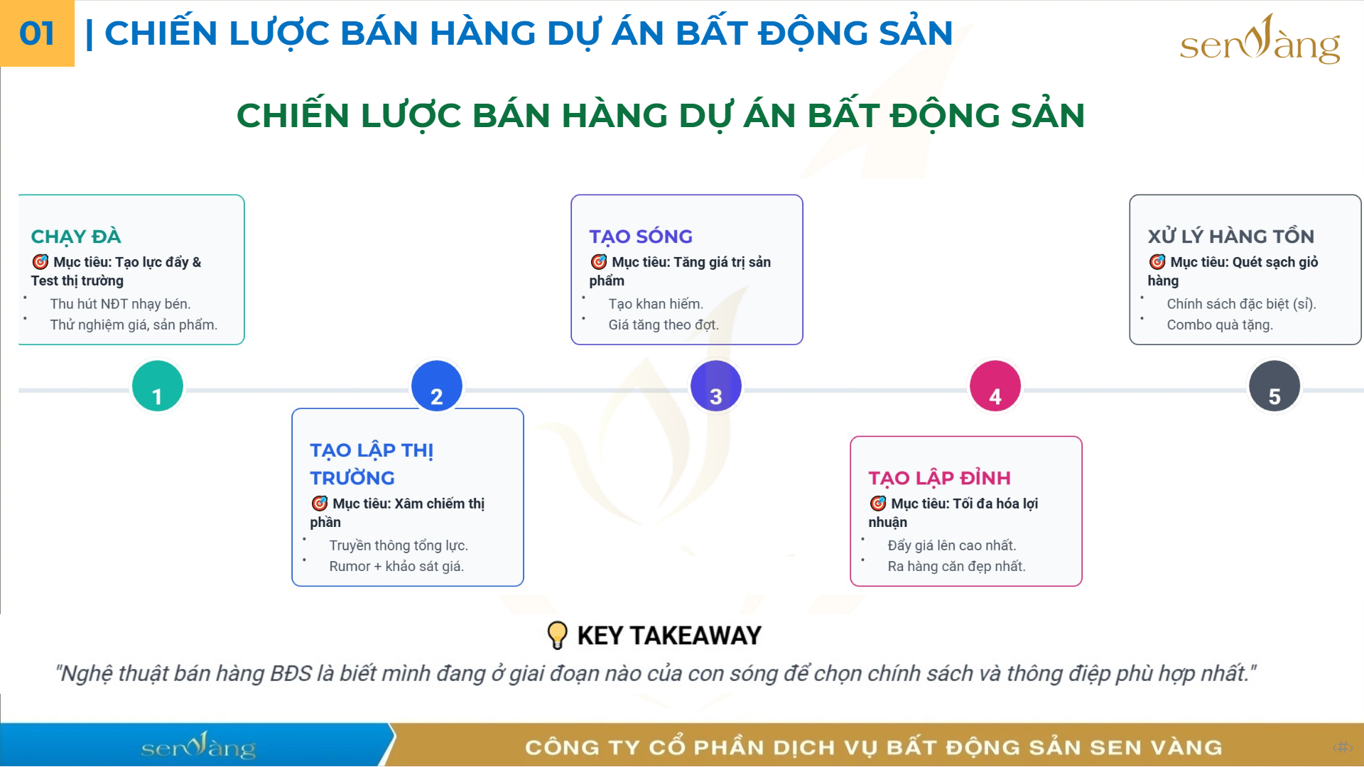 Mỗi giai đoạn trong vòng đời bán hàng của một dự án đòi hỏi một chính sách và thông điệp riêng. “Nghệ thuật bán hàng bất động sản là mình biết mình đang ở giai đoạn nào của con sóng để chọn chính sách và thông điệp phù hợp nhất.”