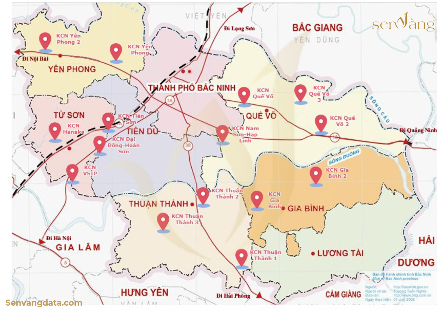 Bản đồ phân bố KCN tại Bắc Ninh. Nguồn: Sen Vàng tổng hợp